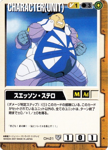 ![]() ![]() | CH-21 スエッソン・ステロ CHARACTER 永久の絆 色:茶 セット対象:UNIT コスト[指定/合計(資源)]:茶1/3(0) 格闘力:1 射撃力:0 防御力:1 特徴:男性/大人 (ダメージ判定ステップ):《①》このカードの部隊にいる、このカードがセットされているユニット以外の、全てのユニットは、ターン終了時まで±0/+1/±0を得る。 「者ども!針の陣!一気にソレイユを落とす!!」 |