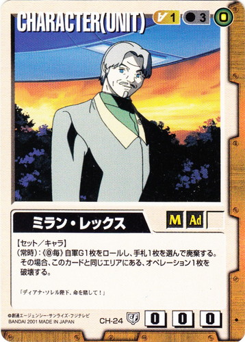 ![]() ![]() | CH-24 ミラン・レックス CHARACTER 永久の絆 色:茶 セット対象:UNIT コスト[指定/合計(資源)]:茶1/3(0) 格闘力:0 射撃力:0 防御力:0 特徴:男性/大人 【セット/キャラ】 (常時):《0毎》自軍G1枚をロールし、手札1枚を選んで廃棄する。その場合、このカードと同じエリアにある、オペレーション1枚を破壊する。 「ディアナ・ソレル陛下、命を賭して!」 |