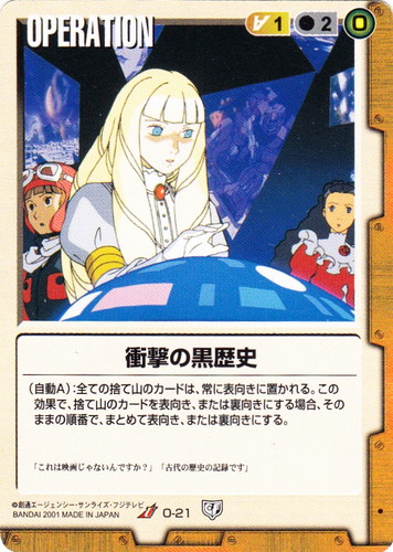 ![]() ![]() | O-21 衝撃の黒歴史 OPERATION 永久の絆 U 色:茶 コスト[指定/合計(資源)]:茶1/2(0) (自動A):全ての捨て山のカードは、常に表向きに置かれる。この効果で、捨て山のカードを表向き、または裏向きにする場合、そのままの順番で、まとめて表向き、または裏向きにする。 「これは映画じゃないんですか?」「古代の歴史の記録です」 |