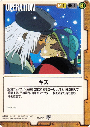 ![]() ![]() | O-22 キス OPERATION 永久の絆 色:茶 コスト[指定/合計(資源)]:茶1/1(0) (配備フェイズ):《0毎》自軍G1枚をロールし、手札1枚を選んで廃棄する。その場合、自軍キャラクター1枚を本来の持ち主の手札に戻す。 「ロラン・・・」 |