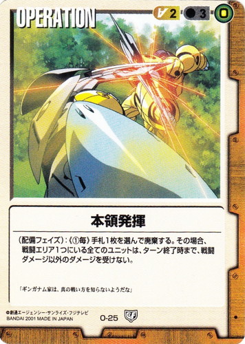 ![]() ![]() | O-25 本領発揮 OPERATION 永久の絆 色:茶 コスト[指定/合計(資源)]:茶2/3(0) (配備フェイズ):《①毎》手札1枚を選んで廃棄する。その場合、戦闘エリア1つにいる全てのユニットは、ターン終了時まで、戦闘ダメージ以外のダメージを受けない。 「ギンガナム家は、真の戦い方を知らないようだな」 |