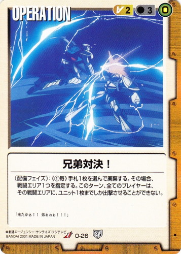 ![]() ![]() | O-26 兄弟対決! OPERATION 永久の絆 色:茶 コスト[指定/合計(資源)]:茶2/3(0) (配備フェイズ):《①毎》手札1枚を選んで廃棄する。その場合、戦闘エリア1つを指定する。このターン、全てのプレイヤーは、その戦闘エリアに、ユニット1枚までしか出撃させることができない。 「来たかぁ!!弟ぉぉぉ!!!」 |