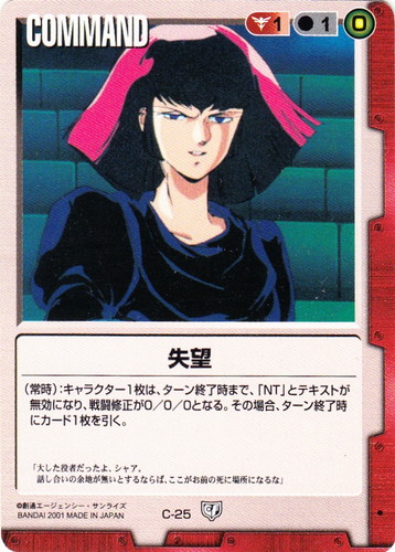 ![]() ![]() | C-25 失望 COMMAND 永久の絆 色:赤 コスト[指定/合計(資源)]:赤1/1(0) (常時):キャラクター1枚は、ターン終了時まで、「NT」とテキストが無効になり、戦闘修正が0/0/0となる。その場合、ターン終了時にカード1枚を引く。 「大した役者だったよ、シャア。話し合いの余地が無いとするならば、ここがお前の死に場所になるな」 |