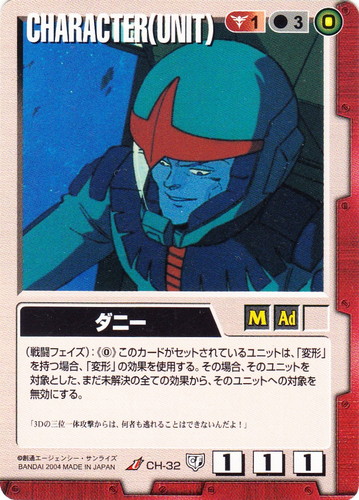 ![]() ![]() | CH-32 ダニー CHARACTER 永久の絆 U 色:赤 セット対象:UNIT コスト[指定/合計(資源)]:赤1/3(0) 格闘力:1 射撃力:1 防御力:1 特徴:男性/大人 (戦闘フェイズ):《0》このカードがセットされているユニットは「変形」を持つ場合、「変形」の効果を使用する。その場合、そのユニットを対象とした、まだ未解決の全ての効果から、そのユニットへの対象を無効にする。 「3Dの三位一体攻撃からは、何者も逃れることはできないんだよ!」 |