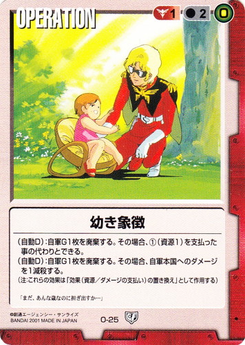 ![]() ![]() | O-25 幼き象徴 OPERATION 永久の絆 色:赤 コスト[指定/合計(資源)]:赤1/2(0) (自動D):自軍G1枚を廃棄する。その場合、①(資源1)を支払った事の代わりとできる。 (自動D):自軍G1枚を廃棄する。その場合、自軍本国へのダメージを1減殺する。 (注:これらの効果は「効果(資源/ダメージの支払い)の置き換え」として作用する) 「まだ、あんな歳なのに担ぎ出すか・・・」 |