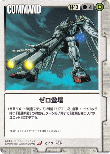 ![]() ![]() | C-17 ゼロ登場 COMMAND 永久の絆 U 色:白 コスト[指定/合計(資源)]:白3/4(0) (自軍ダメージ判定ステップ):戦闘エリアにいる、自軍ユニット1枚が持つ「範囲兵器」の対象を、ターン終了時まで「敵軍配備エリアのユニット」に変更する。 「確認する!シェルターシールドは張っているな?」 |
