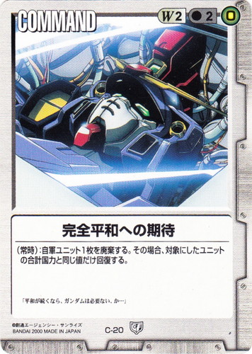 ![]() ![]() | C-20 完全平和への期待 COMMAND 永久の絆 色:白 コスト[指定/合計(資源)]:白2/2(0) (常時):自軍ユニット1枚を廃棄する。その場合、対象にしたユニットの合計国力と同じ値だけ回復する。 「平和が続くなら、ガンダムは必要ない、か・・・」 |