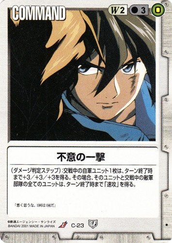![]() ![]() | C-23 不意の一撃 COMMAND 永久の絆 U 色:白 コスト[指定/合計(資源)]:白2/3(0) (ダメージ判定ステップ):交戦中の自軍ユニット1枚は、ターン終了時まで+3/+3/+3を得る。その場合、そのユニットと交戦中の敵軍部隊の全てのユニットは、ターン終了時まで「速攻」を得る。 「悪く思うな。1回は1回だ」 |