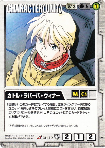 ![]() ![]() | CH-12 カトル・ラバーバ・ウィナー CHARACTER 永久の絆 U 色:白 セット対象:UNIT コスト[指定/合計(資源)]:白3/5① 格闘力:2 射撃力:1 防御力:2 特徴:男性/子供 (自動B):このカードをプレイする場合、自軍ジャンクヤードにあるユニット1枚を、通常のプレイと同様にコストを支払い、自軍配備エリアにリロール状態で出し、そのユニットにこのカードをセットする事ができる。 「カギは僕達が握っている。なんとしても皆のガンダムを回収しなくては」 |