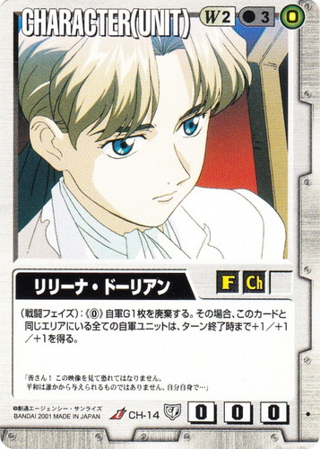 ![]() ![]() | CH-14 リリーナ・ドーリアン CHARACTER 永久の絆 U 色:白 セット対象:UNIT コスト[指定/合計(資源)]:白2/3(0) 格闘力:0 射撃力:0 防御力:0 特徴:女性/子供 (戦闘フェイズ):《0》自軍G1枚を廃棄する。その場合、このカードと同じエリアにいる全ての自軍ユニットは、ターン終了時まで+1/+1/+1を得る。 「皆さん!この映像を見て恐れてはなりません。平和は誰かから与えられるものではありません。自分自身で・・・」 |