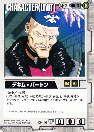 ![]() ![]() | CH-16 デキム・バートン CHARACTER 永久の絆 色:白 セット対象:UNIT コスト[指定/合計(資源)]:白2/3(0) 格闘力:0 射撃力:0 防御力:0 特徴:男性/大人 【セット/キャラ】 (リロールフェイズ):《0》このカードが「女性」と「子供」を持つキャラクターにセットされている場合、そのキャラクターをリロールする。 「マリーメイア様!今こそ地球圏全ての頂点にお立ち下さい!!」 |