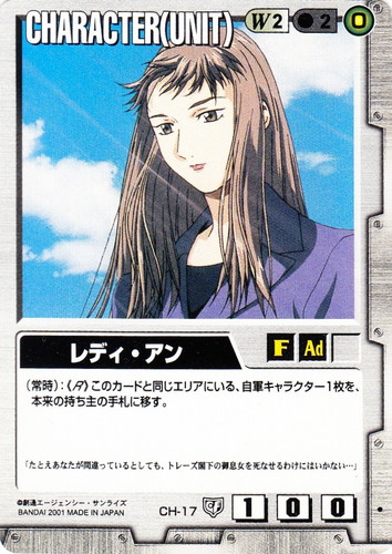 ![]() ![]() | CH-17 レディ・アン CHARACTER 永久の絆 色:白 セット対象:UNIT コスト[指定/合計(資源)]:白2/2(0) 格闘力:1 射撃力:0 防御力:0 特徴:女性/大人 (常時):《R》このカードと同じエリアにいる、自軍キャラクター1枚を、本来の持ち主の手札に移す。 「たとえあなたが間違っているとしても、トレーズ閣下の御息女を死なせるわけにはいかない・・・」 |