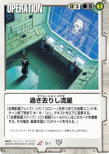 ![]() ![]() | O-1 過ぎ去りし流星 OPERATION 永久の絆 R 色:白 コスト[指定/合計(資源)]:白3/5① (自軍配備フェイズ):《R》「コロニー」を持つ全ての自軍ユニットを、ターン終了時まで*/*/1とし、テキストを以下に変更する。 「(自軍帰還ステップ):《①》戦闘フィールドにいるこのカードを廃棄する。その場合、敵軍本国に10ダメージを与える。」 「フッフッフッフ、そうだ、我々はいつでもあのコロニーを落とすことができる」 |