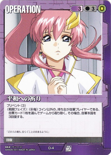 ![]() ![]() | O-4 平和への祈り OPERATION DXウィナーズスターター 純白の鋼翼 色:紫 コスト[指定/合計(資源)]:紫3/3(0) 特徴:回復 プリベント(3) (戦闘フェイズ):《0毎》コイン以外の、持ち主が自軍プレイヤーである、自軍カード1枚を選んでゲームから取り除く。その場合、自軍本国を3回復する。 「どの人の魂も、安らぐことの出来るように」 |