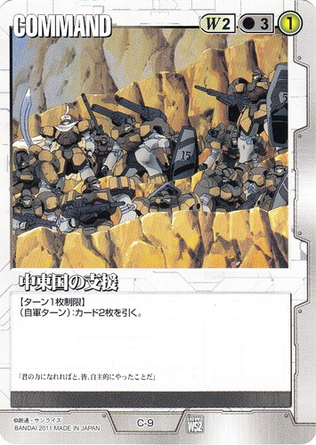 ![]() ![]() | C-9 中東国の支援 COMMAND DXウィナーズスターター 純白の鋼翼 色:白 コスト[指定/合計(資源)]:白2/3① 【ターン1枚制限】 (自軍ターン):カード2枚を引く。 「君の力になれればと、皆、自主的にやったことだ」 |