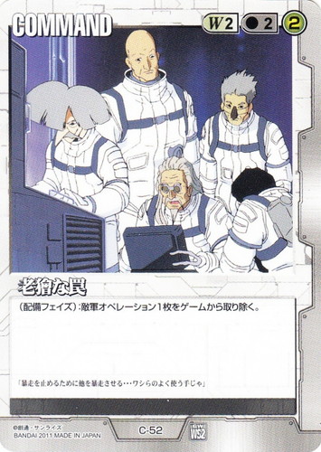 ![]() ![]() | C-52 老獪な罠 COMMAND DXウィナーズスターター 純白の鋼翼 色:白 コスト[指定/合計(資源)]:白2/2② (配備フェイズ):敵軍オペレーション1枚をゲームから取り除く。 「暴走を止めるために他を暴走させる・・・ワシらのよく使う手じゃ」 |