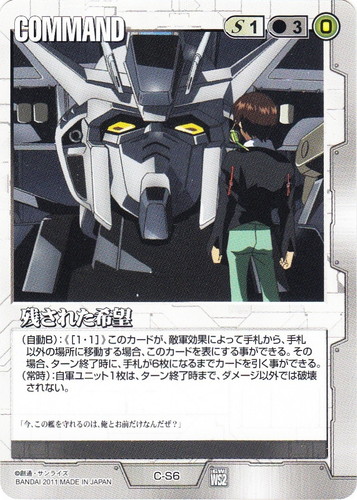 ![]() ![]() | C-S6 残された希望 COMMAND DXウィナーズスターター 純白の鋼翼 色:白 コスト[指定/合計(資源)]:白1/3(0) (自動B):《[1・1]》このカードが、敵軍効果によって手札から、手札以外の場所に移動する場合、このカードを表にする事ができる。その場合、ターン終了時に、手札が6枚になるまでカードを引く事ができる。 (常時):自軍ユニット1枚は、ターン終了時まで、ダメージ以外では破壊されない。 「今、この艦を守れるのは、俺とお前だけなんだぜ?」 |