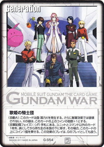 ![]() ![]() | G-S54 歌姫の騎士団 Generation DXウィナーズスターター 純白の鋼翼 色:白 (自動A):このカードは白国力Xを発生する。さらに敵軍効果では破壊されない。Xの値は、このカードの上のコインの個数+1とする。 (自軍配備フェイズ):《R》手札にある、ユニットとコマンド以外のカード1枚を、表にしてから持ち主の本国の下に移す。その場合、このカードの上にコイン1個を乗せる。この効果のプレイは、Gのプレイとしても扱う。 |