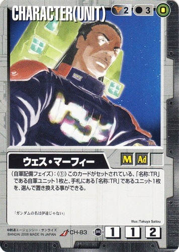 ![]() ![]() | CH-83 ウェス・マーフィー CHARACTER 不敗の流派 U 色:黒 セット対象:UNIT コスト[指定/合計(資源)]:黒2/3(0) 格闘力:1 射撃力:1 防御力:2 特徴:男性/大人 (自軍配備フェイズ):《①》このカードがセットせれている、「名称:TR」である自軍ユニット1枚と、手札にある「名称:TR」であるユニット1枚を、選んで置き換える事ができる。 「ガンダムの名は伊達じゃない」 illust:Takuya Saitou |
