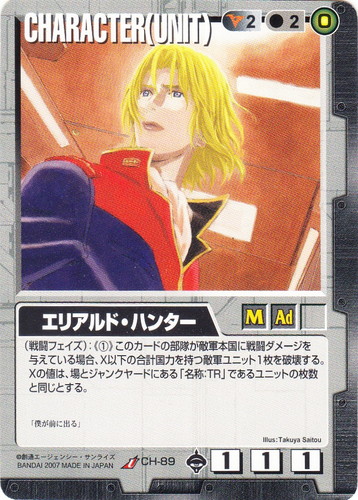 ![]() ![]() | CH-89 エリアルド・ハンター CHARACTER 戦慄の兵威 色:黒 セット対象:UNIT コスト[指定/合計(資源)]:黒2/2(0) 格闘力:1 射撃力:1 防御力:1 特徴:男性/大人 (戦闘フェイズ):《①》このカードの部隊が敵軍本国に戦闘ダメージを与えている場合、X以下の合計国力を持つ敵軍ユニット1見を破壊する。Xの値は、場とジャンクヤードにある「名称:TR」であるユニットの枚数と同じとする。 「僕が前に出る」 illust:Takuya Saitou |