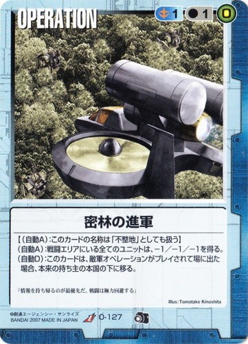 ![]() ![]() | O-127 密林の進軍 OPERATION ドラマチックブースター 前線のフォトグラフ U 色:青 コスト[指定/合計(資源)]:青1/1(0) 【(自動A):このカードの名称は「不整地」としても扱う】 (自動A):戦闘エリアにいる全てのユニットは、-1/-1/-1を得る。 (自動D):このカードは、敵軍オペレーションがプレイされて場に出た場合、本来の持ち主の本国の下に移る。 「情報を持ち帰るのが最優先だ。戦闘は極力回避する」 illust:Tomotake Kinoshita |