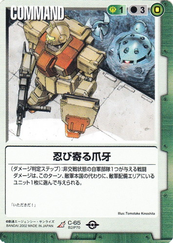![]() ![]() | O-42 包囲された牙 OPERATION 革新の波濤 色:緑 コスト[指定/合計(資源)]:緑1/3(0) (戦闘フェイズ):《0》敵軍ユニットの枚数が、自軍ユニットの枚数よりも多い場合、自軍ユニット1枚は、ターン終了時まで「速攻」を得る。 「敵モビルスーツのキャノンに気をつけろ!敵の懐に飛び込むことだ」 illust:Tomotake Kinoshita |