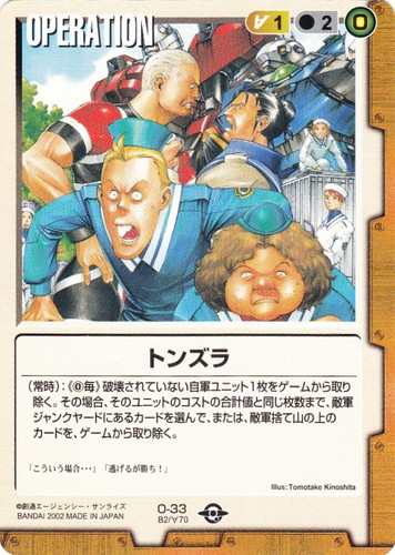 ![]() ![]() | O-78 戦後の復旧 OPERATION 蒼海の死闘 U 色:青 コスト[指定/合計(資源)]:青1/3(0) (自動B):このカードがプレイされて場に出た場合、このカードの上にコイン1個を乗せる。 (自軍戦闘フェイズ):《0》自軍青基本G1枚を廃棄する。その場合、自軍本国をX回復し、このカードの上にコイン1個を乗せる。Xの値は、このカードの上にある(プレイ時の)コインの個数の2倍とする。 「・・・しかし便利なもんだな、モビルスーツって奴は」 illust:Tomotake Kinoshita |