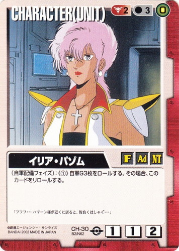 ![]() ![]() | CH-30 イリア・パゾム CHARACTER ベースドブースター2 色:赤 セット対象:UNIT コスト[指定/合計(資源)]:赤2/3(0) 格闘力:1 射撃力:1 防御力:2 特徴:女性/大人/NT (自軍配備フェイズ):《①》自軍G3枚をロールする。その場合、このカードをリロールする。 「フフフ・・・ハマーン様が近くに居ると、皆良くはしゃぐ・・・」 |