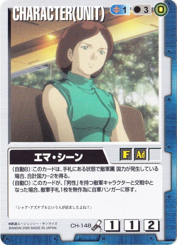 ![]() ![]() | CH-23 エマ・シーン CHARACTER エクステンションブースター 色:黒 セット対象:UNIT コスト[指定/合計(資源)]:黒1/1(0) 格闘力:1 射撃力:1 防御力:1 特徴:女性/大人 (自動B):このカードがプレイされて場に出た場合、カード1枚を引く。 (自動D):このカードがセトされているユニットは、敵軍Gが破壊されて廃棄された場合、敵軍配備エリアにリロール状態で移る。 「バスク・オム大佐の親書を持ってまいりました」 |