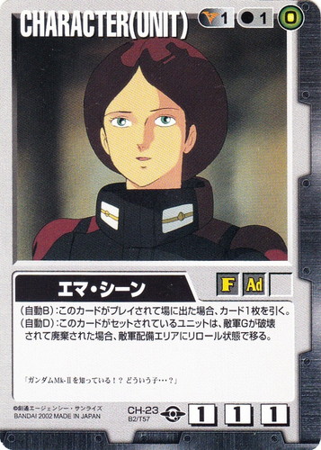 ![]() ![]() | CH-23 エマ・シーン CHARACTER ベースドブースター2 色:黒 セット対象:UNIT コスト[指定/合計(資源)]:黒1/1(0) 格闘力:1 射撃力:1 防御力:1 特徴:女性/大人 (自動B):このカードがプレイされて場に出た場合、カード1枚を引く。 (自動D):このカードがセットされているユニットは、敵軍Gが破壊されて廃棄された場合、敵軍配備エリアにリロール状態で移る。 「ガンダムMk-IIを知っている?どういう子・・・?」 |