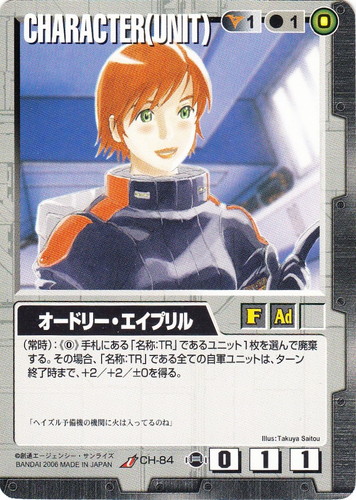 ![]() ![]() | CH-84 オードリー・エイプリル CHARACTER 不敗の流派 U 色:黒 セット対象:UNIT コスト[指定/合計(資源)]:黒1/1(0) 格闘力:0 射撃力:1 防御力:1 特徴:女性/大人 (常時):《0》手札にある「名称:TR」であるユニット1枚を選んで廃棄する。その場合、「名称:TR」である全ての自軍ユニットは、ターン終了時まで、+2/+2/±0を得る。 「ヘイズル予備機の機関に火は入ってるのね」 illust:Takuya Saitou |