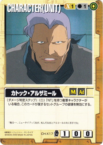 ![]() ![]() | CH-X17 カトック・アルザミール CHARACTER 刻の末裔 色:茶 セット対象:UNIT コスト[指定/合計(資源)]:茶1/1(0) 格闘力:1 射撃力:0 防御力:0 特徴:男性/大人 (ダメージ判定ステップ):《①》「NT」を持つ敵軍キャラクターがいる場合、このカードが属するセットグループの破壊を無効にする。 「俺は・・・、ニュータイプって奴が、死んだ女房とアルコールの次に苦手でな」 |