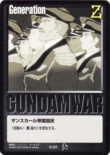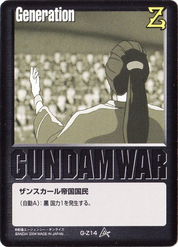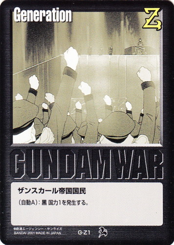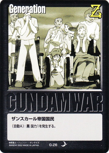 ![]() ![]() | G-Z6 ザンスカール帝国国民 Generation 月下の戦塵 色:黒 (自動A):黒国力1を発生する。 |