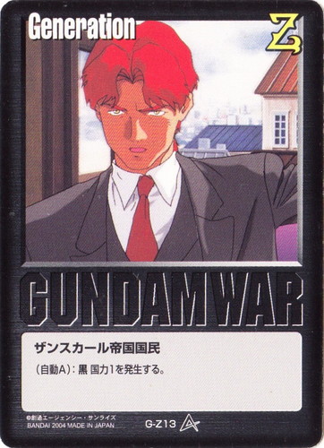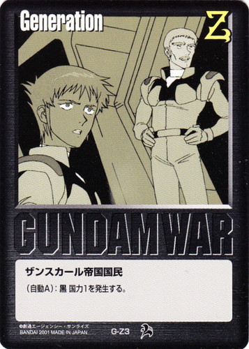![]() ![]() | G-Z3 ザンスカール帝国国民 Generation 新世紀の鼓動 色:黒 (自動A):黒国力1を発生する。 |