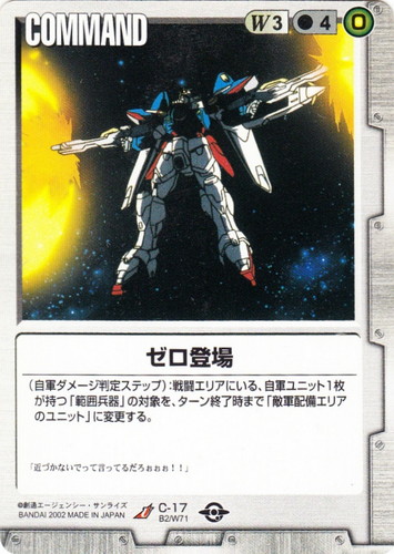 ![]() ![]() | C-17 ゼロ登場 COMMAND 永久の絆 U 色:白 コスト[指定/合計(資源)]:白3/4(0) (自軍ダメージ判定ステップ):戦闘エリアにいる、自軍ユニット1枚が持つ「範囲兵器」の対象を、ターン終了時まで「敵軍配備エリアのユニット」に変更する。 「確認する!シェルターシールドは張っているな?」 |