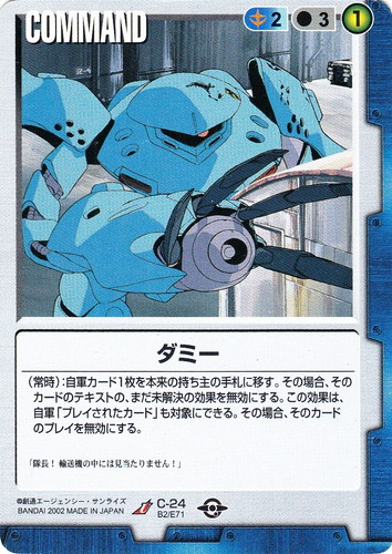 ![]() ![]() | C-24 ダミー COMMAND ベースドブースター2 U 色:青 コスト[指定/合計(資源)]:青2/3① (常時):自軍カード1枚を本来の持ち主の手札に移す。その場合、そのカードのテキストの、まだ未解決の効果を無効にする。この効果は、自軍「プレイされたカード」も対象にできる。その場合、そのカードのプレイを無効にする。 「隊長!輸送機の中には見当たりません!」 |