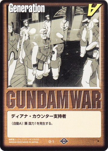 ![]() ![]() | G-1 ディアナ・カウンター支持者 Generation 撃墜王出撃 色:茶 (自動):∀国力1を発生する。 |