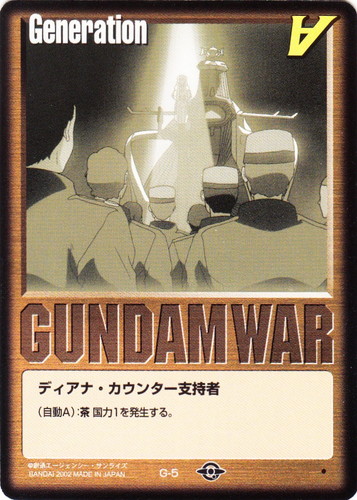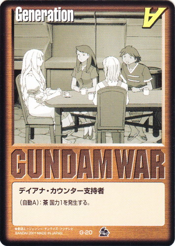 ![]() ![]() | G-1 ディアナ・カウンター支持者 Generation ベースドブースター2 色:茶 (自動A):茶国力1を発生する。 |