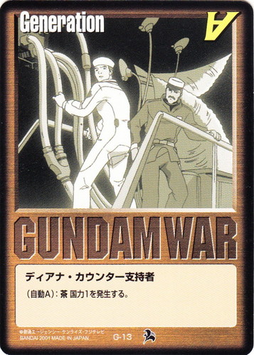 ![]() ![]() | G-15 ディアナ・カウンター支持者 Generation ベースドブースター3 色:茶 (自動A):茶国力1を発生する。 初出「ニュータイプ100%コレクション ∀ガンダム Vol.2/菱沼義仁」 |