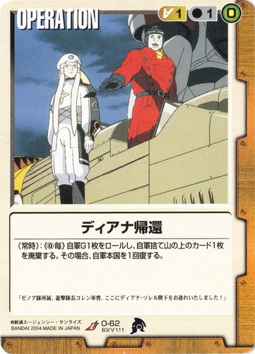 ![]() ![]() | O-62 ディアナ帰還 OPERATION ベースドブースター3 U 色:茶 コスト[指定/合計(資源)]:茶1/1(0) (常時):《0毎》自軍G1枚をロールし、自軍捨て山の上のカード1枚を廃棄する。その場合、自軍本国を1回復する。 「ゼノア隊所属、遊撃隊長コレン軍曹、ここにディアナ・ソレル陛下をお連れいたしました!」 |