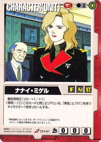 ![]() ![]() | CH-41 ナナイ・ミゲル CHARACTER 革新の波濤 U 色:赤 セット対象:UNIT コスト[指定/合計(資源)]:赤1/2(0) 格闘力:0 射撃力:0 防御力:0 特徴:女性/大人/NT 艦船用修正(±0/+1/+1) (常時):《①》このカードと同じエリアにいる、「男性」と「NT」を持つキャラクター1枚をリロールする。 「神経過敏になってますが、ガードマンとしては最適です。コロニーの風景が精神安定剤になりましょう」 |