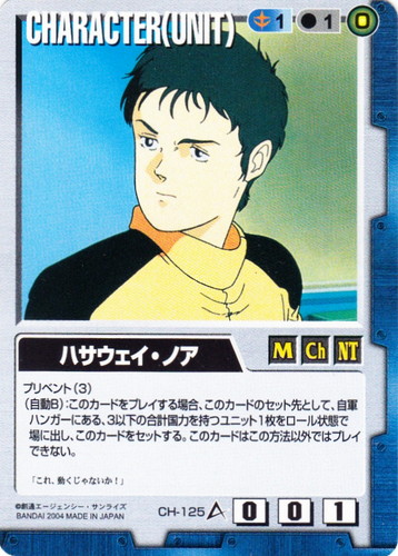 ![]() ![]() | CH-125 ハサウェイ・ノア CHARACTER 宿命の螺旋 色:青 セット対象:UNIT コスト[指定/合計(資源)]:青1/1(0) 格闘力:0 射撃力:0 防御力:1 特徴:男性/子供/NT プリベント(3) (自動B):このカードをプレイする場合、このカードのセット先として、自軍ハンガーにある、3以下の合計国力を持つユニット1枚をロール状態で場に出し、このカードをセットする。このカードはこの方法以外ではプレイできない。 「これ、動くじゃないか!」 |