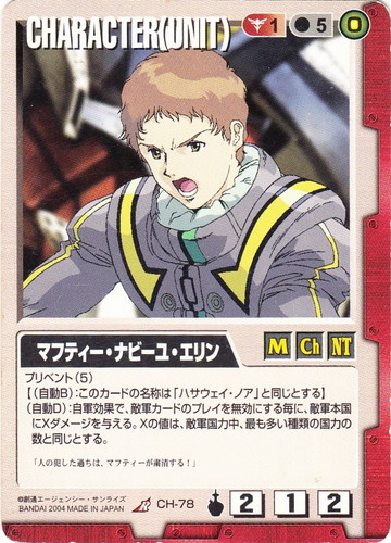 ![]() ![]() | CH-78 マフティー・ナビーユ・エリン CHARACTER 烈火の咆哮 R 色:赤 セット対象:UNIT コスト[指定/合計(資源)]:赤1/5(0) 格闘力:2 射撃力:1 防御力:2 特徴:男性/子供/NT プリベント(5) 【(自動B):このカードの名称は「ハサウェイ・ノア」と同じとする】 (自動D):自軍効果で、敵軍カードのプレイを無効にする毎に、敵軍本国にXダメージを与える。Xの値は、敵軍国力中、最も多い種類の国力の数と同じとする。 「人の犯した過ちは、マフティーが粛清する!」 |
