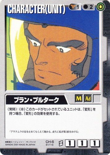 ![]() ![]() | CH-6 ブラン・ブルターク CHARACTER ベースドブースター 色:黒 セット対象:UNIT コスト[指定/合計(資源)]:黒1/2(0) 格闘力:1 射撃力:1 防御力:1 特徴:男性/大人 (常時):《0》このカードがセットされているユニットは、「変形」を持つ場合、「変形」の効果を使用する。 「アウドムラの足を止めてもらえて助かる。直ちに私が第2波をかける」 |