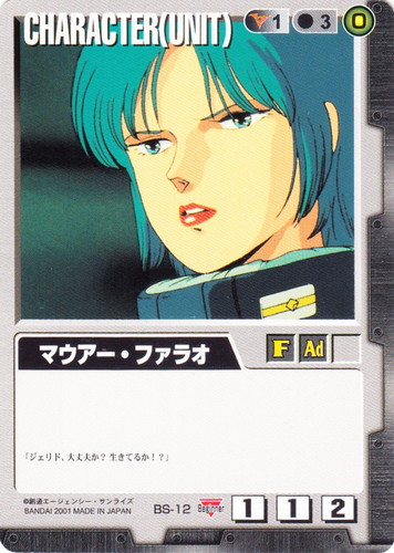 ![]() ![]() | BS-12 マウアー・ファラオ CHARACTER 入門用スターター「地球連邦+ティターンズ」セット 色:黒 セット対象:UNIT コスト[指定/合計(資源)]:黒1/3(0) 格闘力:1 射撃力:1 防御力:2 特徴:女性/大人 「ジェリド、大丈夫か?生きてるか!?」 |