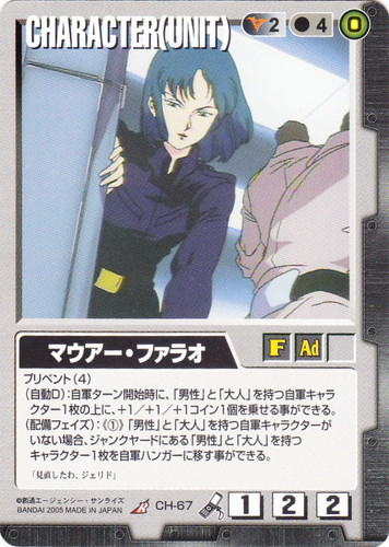 ![]() ![]() | CH-21 マウアー・ファラオ CHARACTER ベースドブースター2 U 色:黒 セット対象:UNIT コスト[指定/合計(資源)]:黒1/3(0) 格闘力:1 射撃力:1 防御力:2 特徴:女性/大人 (常時):《0》このカードと同じエリアにいる、破壊されている「男性」を持つキャラクター1枚を、本来の持ち主の手札に移す。 「ジェリドを当て馬に使ったのか、シロッコ!」 |