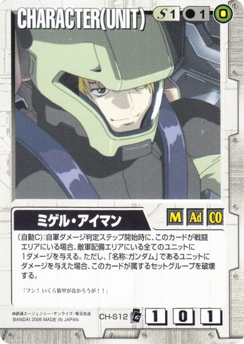![]() ![]() | CH-S12 ミゲル・アイマン CHARACTER 刻の末裔 色:白 セット対象:UNIT コスト[指定/合計(資源)]:白1/1(0) 格闘力:1 射撃力:0 防御力:1 特徴:男性/大人/CO (自動C):自軍ダメージ判定ステップ開始時に、このカードが戦闘エリアにいる場合、敵軍配備エリアにいる全てのユニットに1ダメージを与える。ただし、「名称:ガンダム」であるユニットにダメージを与えた場合、このカードが属するセットグループを破壊する。 「フン!いくら装甲が良かろうが!!」 |
