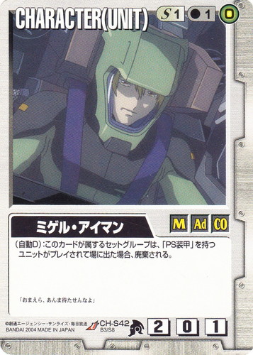 ![]() ![]() | CH-S42 ミゲル・アイマン CHARACTER ベースドブースター3 U 色:白 セット対象:UNIT コスト[指定/合計(資源)]:白1/1(0) 格闘力:2 射撃力:0 防御力:1 特徴:男性/大人/CO (自動D):このカードが属するセットグループは「PS装甲」を持つユニットがプレイされて場に出た場合、廃棄される。 「おまえら、あんま待たせんなよ」 |