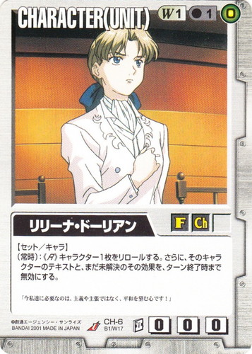 ![]() ![]() | CH-6 リリーナ・ドーリアン CHARACTER ベースドブースター U 色:白 セット対象:UNIT コスト[指定/合計(資源)]:白1/1(0) 格闘力:0 射撃力:0 防御力:0 特徴:女性/子供 【セット/キャラ】 (常時):《R》キャラクター1枚をリロールする。さらに、そのキャラクターのテキストと、まだ未解決のその効果を、ターン終了時まで無効にする。 「今私達に必要なのは、主義や主張ではなく、平和を望む心です!」 |