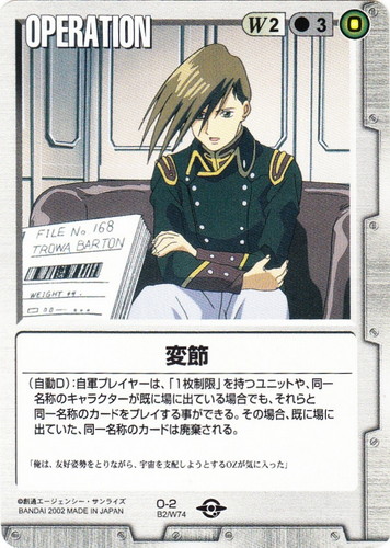 ![]() ![]() | O-2 変節 OPERATION ベースドブースター2 色:白 コスト[指定/合計(資源)]:白2/3(0) (自動D):自軍キャラクターは、「1枚制限」を持つユニットや、同一名称のキャラクターが既に場に出ている場合でも、新たに、それらと同じ名称を持つカードをプレイする事ができる。その場合、既に場に出ていた、同一名称のカードは廃棄される。 「俺は、友好姿勢をとりながら、宇宙を支配しようとするOZが気に入った」 |